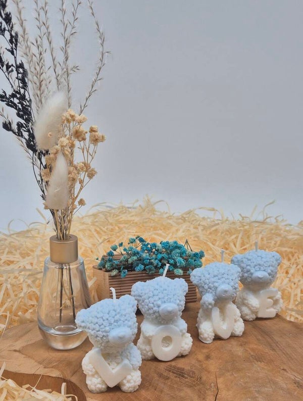 Deze unieke kaarsenset bestaat uit vier beertjes, elk met een letter op hun buik, samen goed voor het woord LOVE. Gegoten in een verfijnde ombre kleur beige naar wit. Deze kaarsen zijn perfect als cadeau voor een geliefde, een babyshower, of gewoon als een toevoeging aan je interieur.
