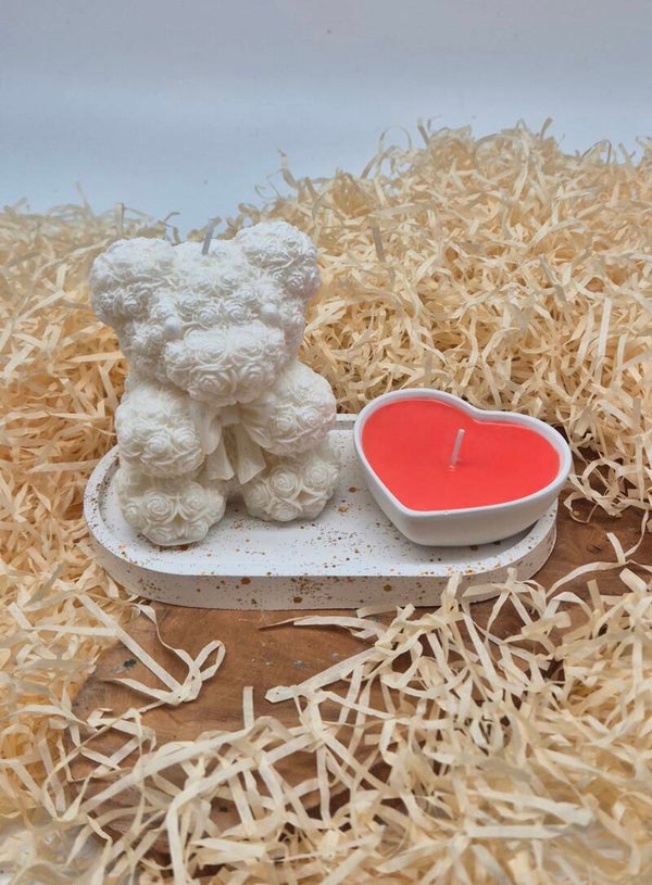 Een leuke set bestaande uit een onderschaaltje, een wat grotere berenkaars en een klein schaaltje in de vorm van een hart gevuld met kaarsvet. Deze ser bevat ongeveer 310 gram kaarsvet en is verkrijgbaar in diverse geuren. Daarnaast kan de kleur van de beer ook naar wens worden gekozen.