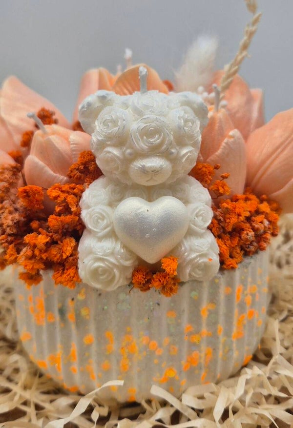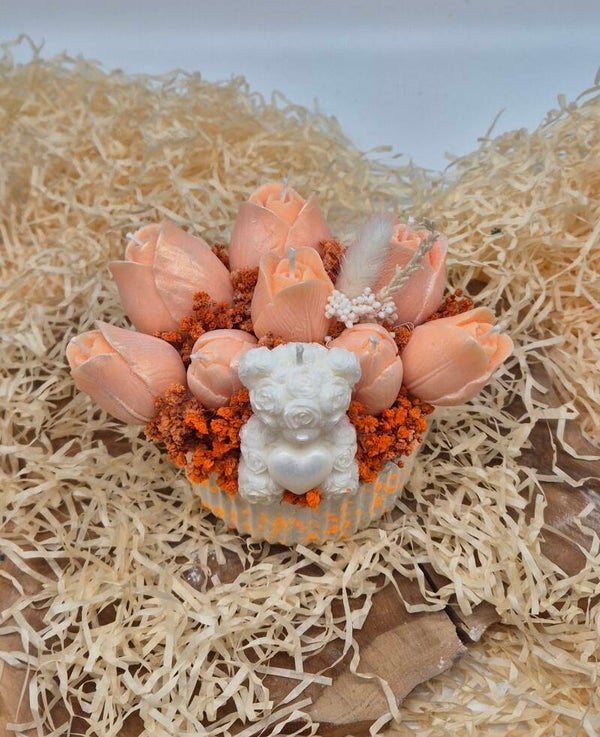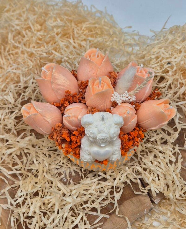 Een bakje gevuld met tulpenkaarsen en een beertje. Het boeket bestaat uit 360gram kaarsvet en is verkrijgbaar in diverse kleuren en geuren.